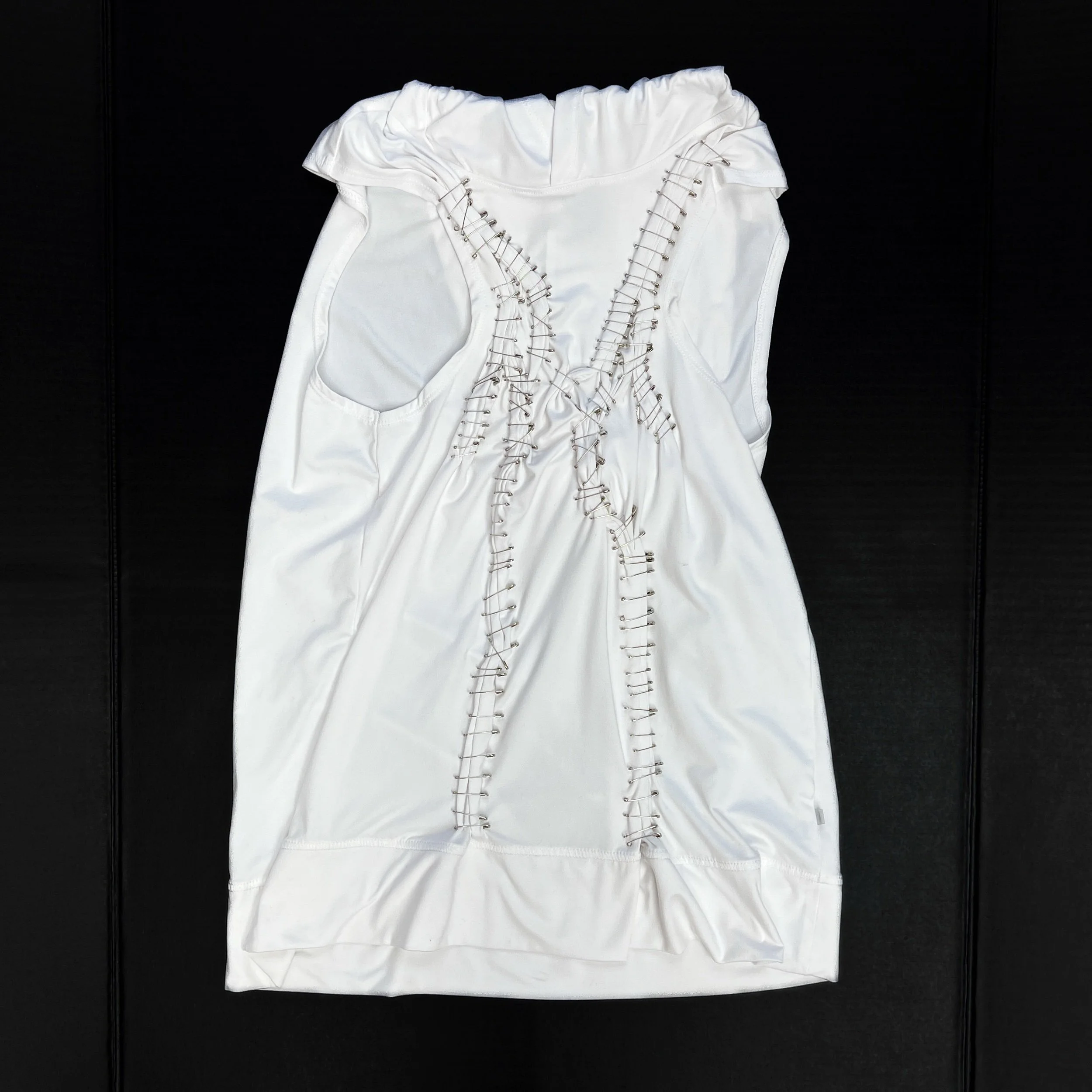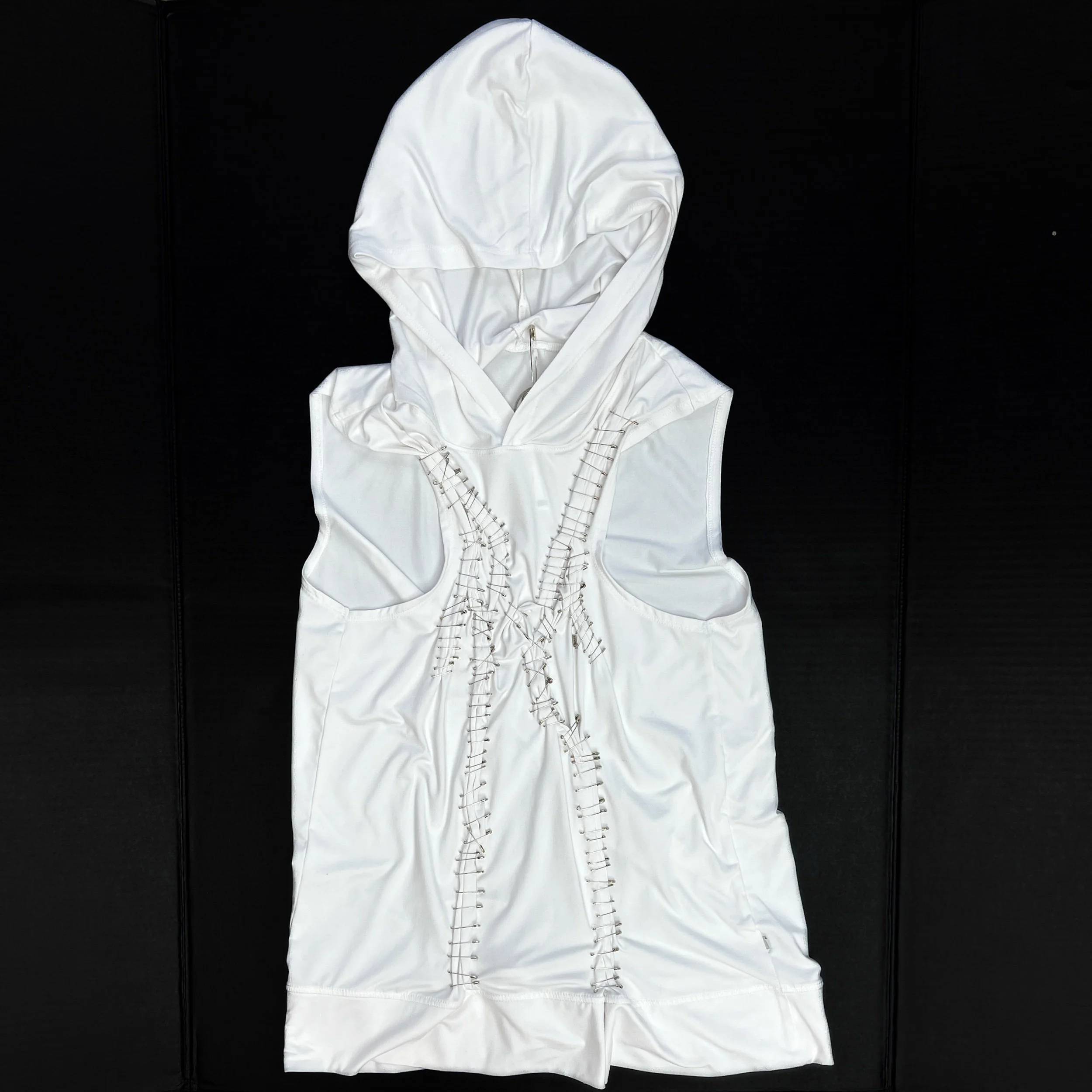 White stretch knit hooded tank. Pulled and pinned with steel safety pins. One of a kind.