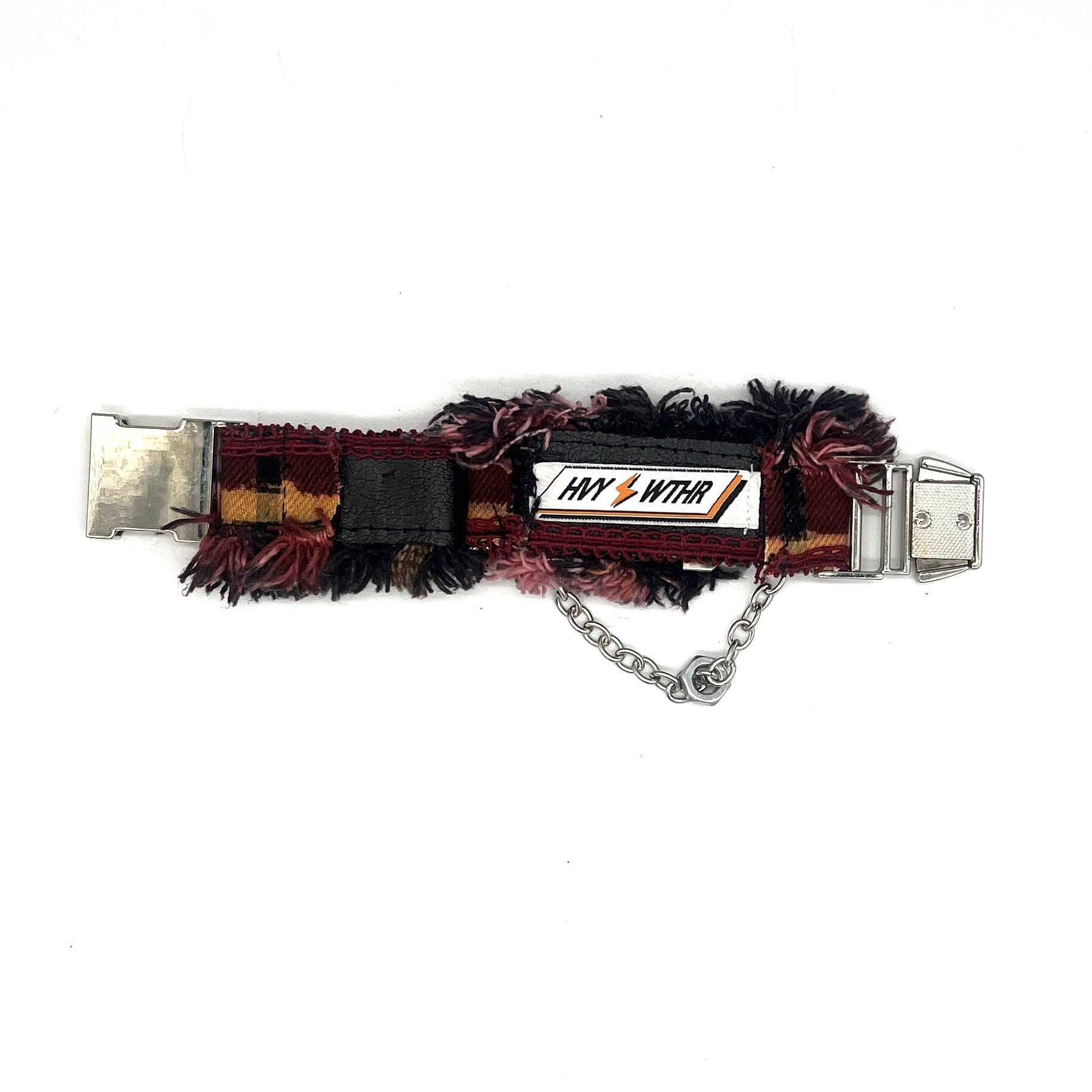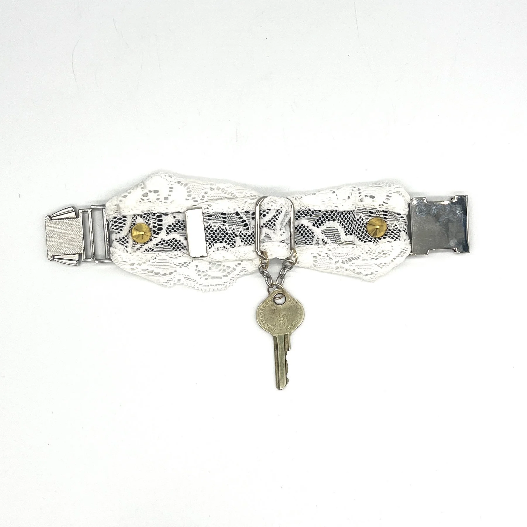 Hand sewn wrist cuff featuring lace, chain, a large key, cone studs, and a metal adjustable buckle. Finished with a metal buckle.