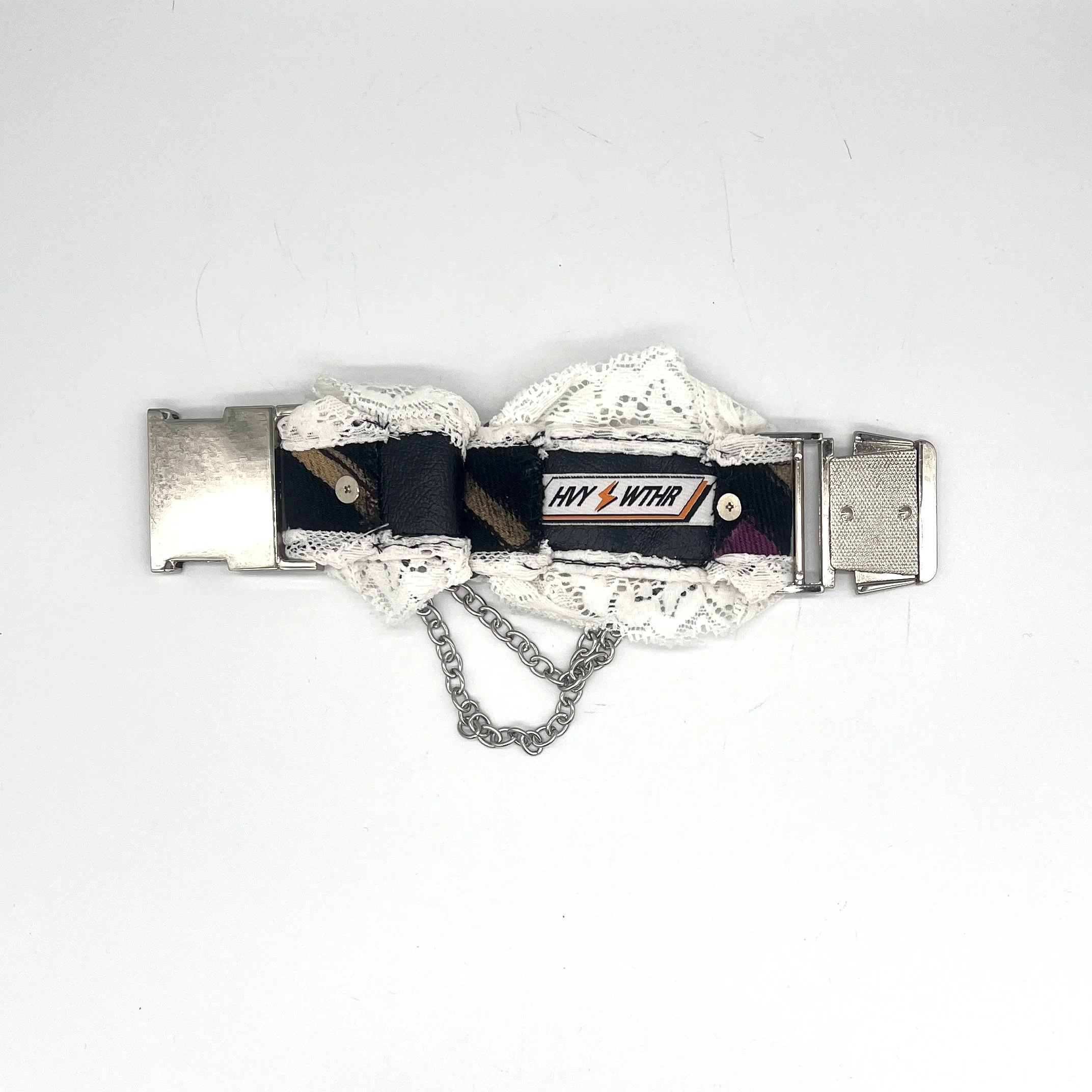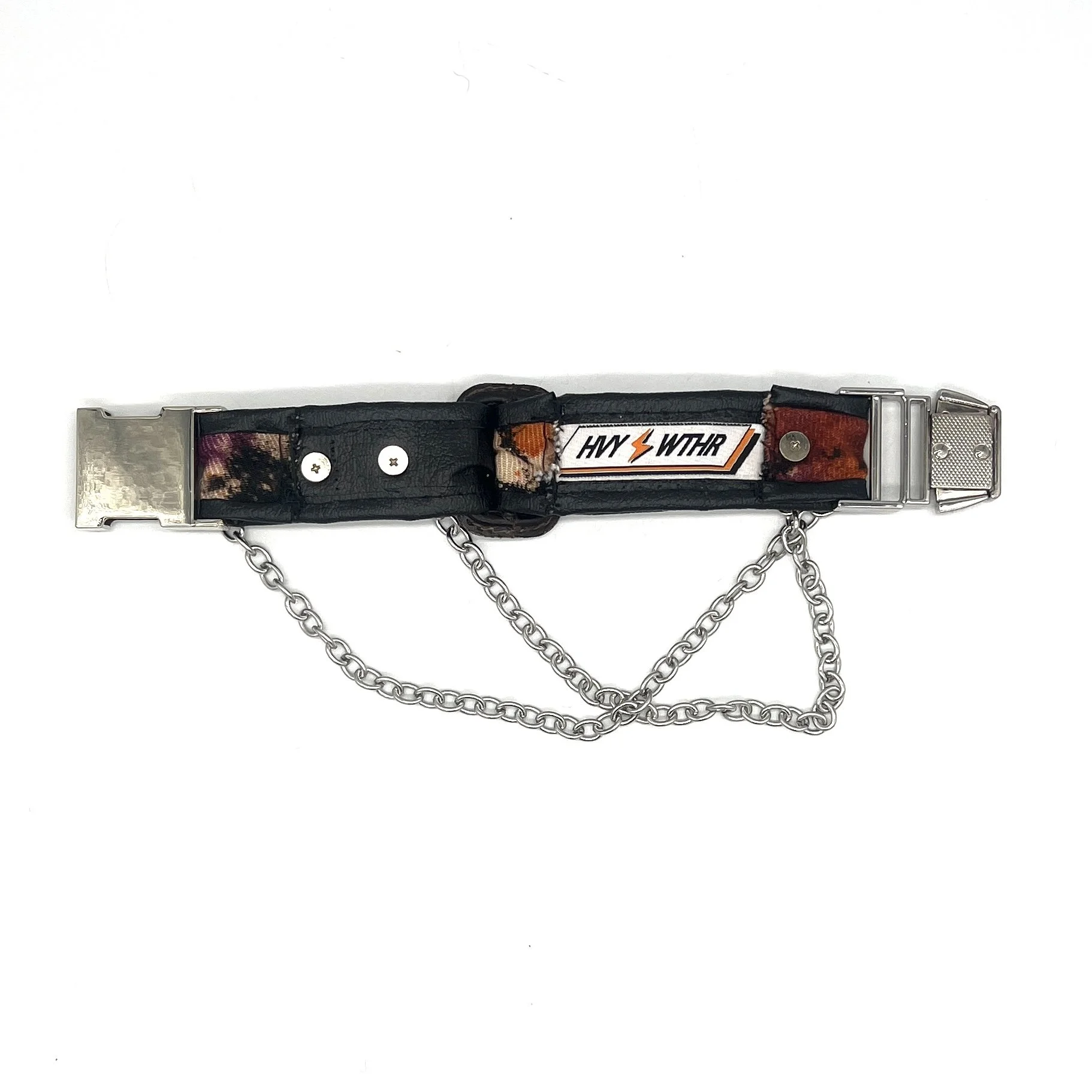 Hand sewn wrist cuff featuring chains, cone studs, and a metal adjustable buckle. Finished with a large metal buckle.
