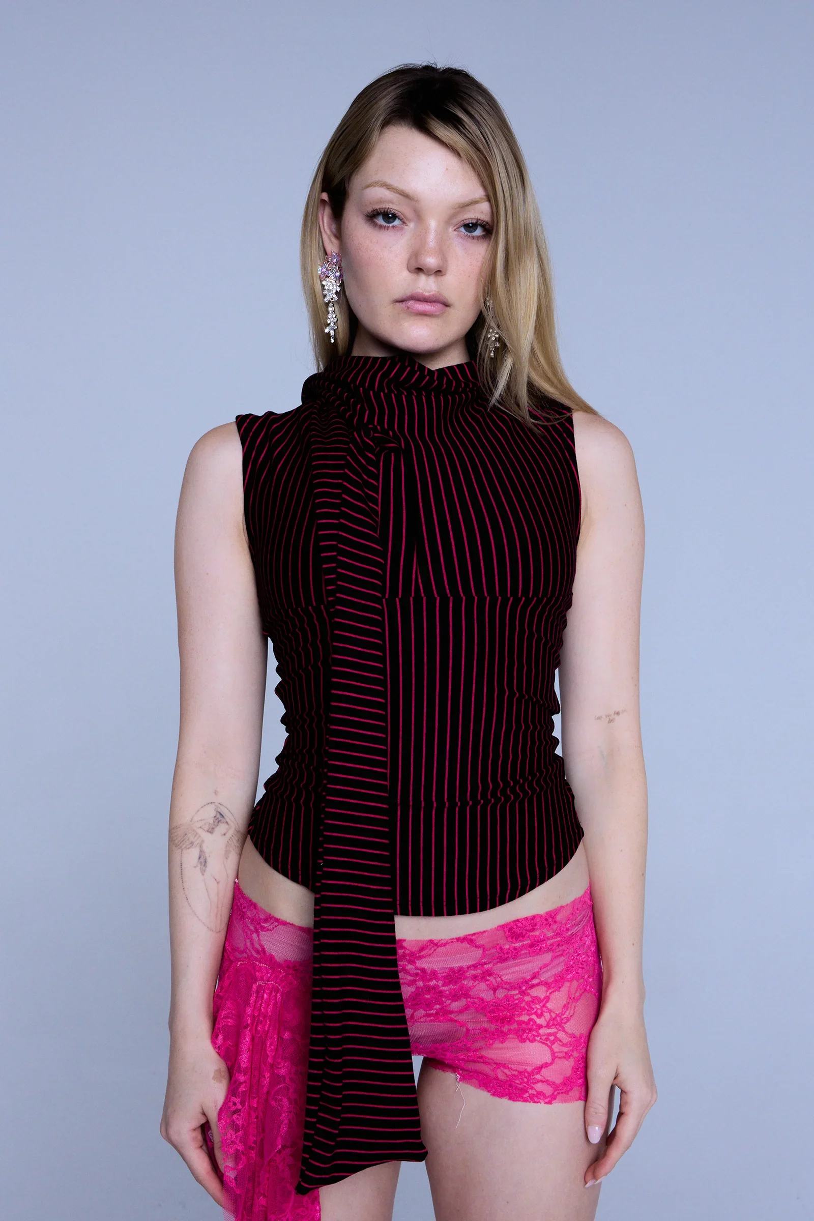 Sleeveless fitted stretch blouse, with customizable front ties, create whatever neckline your heart desires