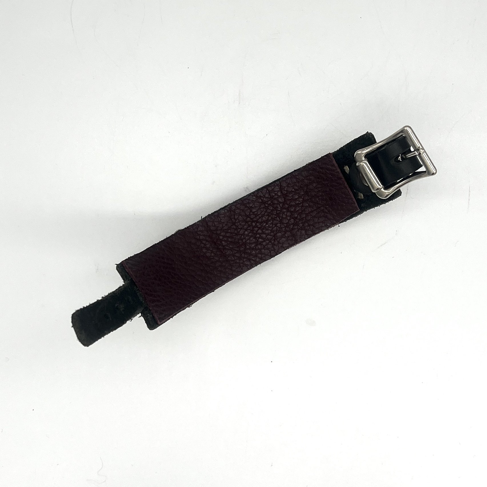 Black leather cuff featuring cone studs and a purple leather backing. Metal buckle closure.
