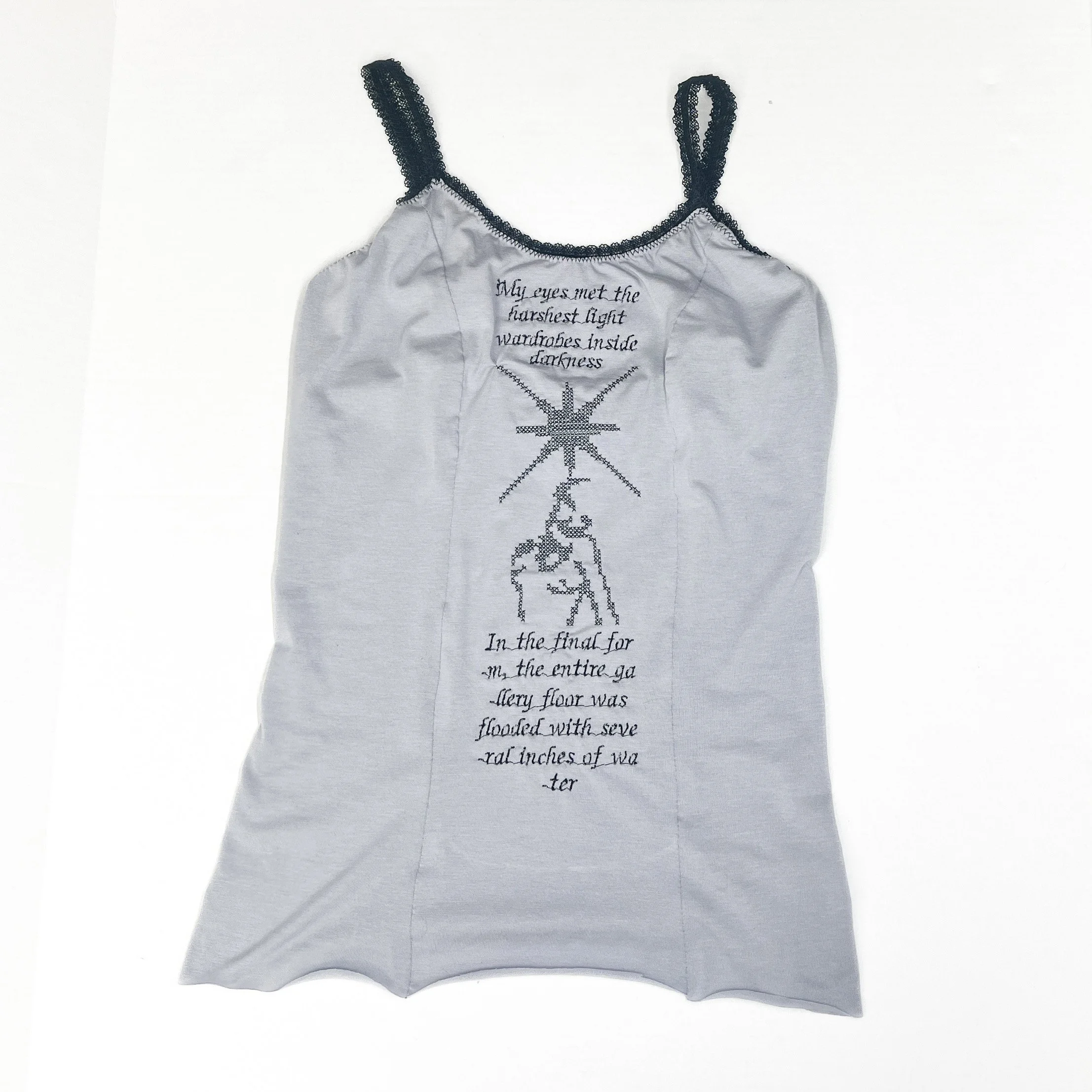 1/1 tank in ultra soft cotton with cross stitching, lace trim, and an embroidered poem.